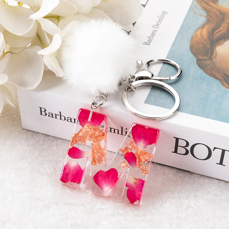 1 pz vero fiore secco lettera portachiavi alfabeto inglese portachiavi con pompon bianco gradiente resina parole artigianato Charms borsa